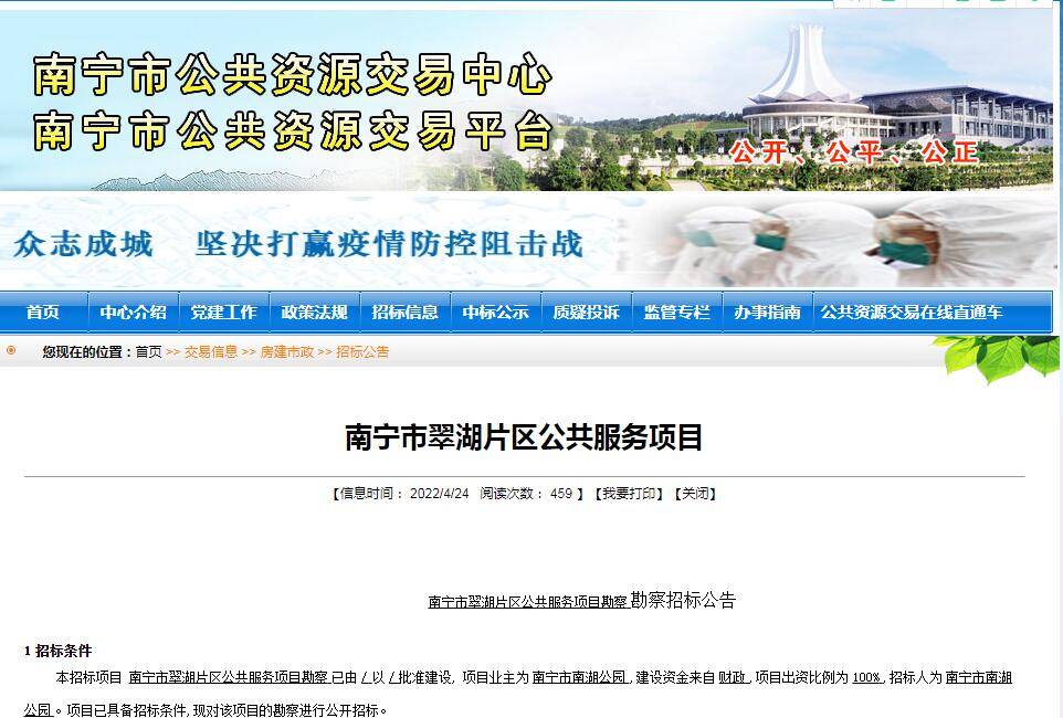 4月24日,南宁市公共资源交易中心发布南宁市翠湖片区公共服务项目勘察及设计招标,该项目除了建设综合性体育休闲公园,还配建了小学、幼儿园等配套设施。