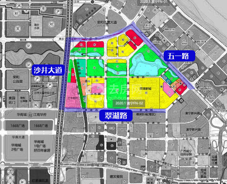 翠湖片区的江南新公园具体是位属富宁片区FN-02(五一西路)单元,早在2020年就对该板块发布控规,从控规上可以看到临近水系确实是规划城公园用地。
