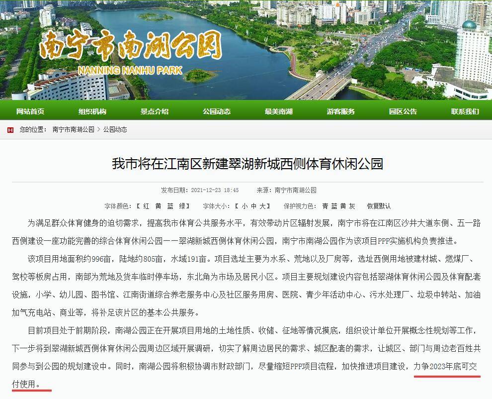 ▲2021年12月23日,在南宁市南湖公园网站上关于翠湖新城西侧体育休闲公园信息