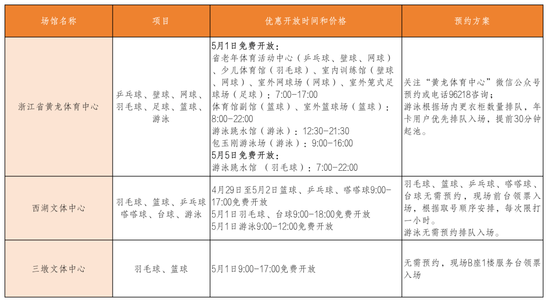 浙江省黄龙体育中心、西湖文体中心、三墩文体中心3个体育场馆向大众惠民开放。