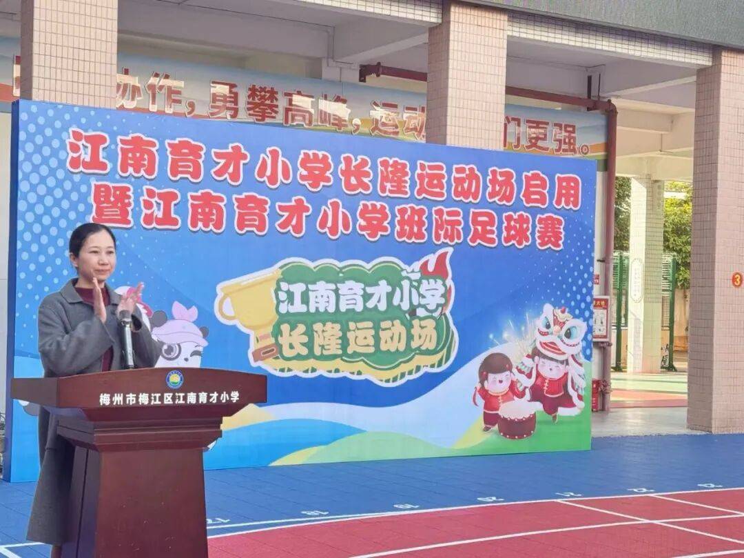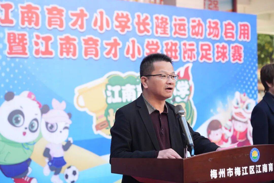 最后,梅州市体育局副局长李新海庄严宣布:“江南育才小学长隆运动场启用暨班际足球赛决赛开赛!” 现场掌声雷动,气氛达到高潮。