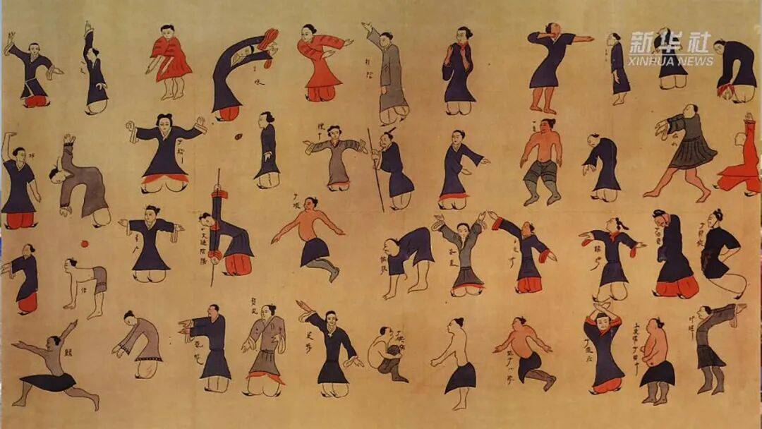 最引人入胜的,莫过于那幅彩绘的《导引图》——44个人物,男女老少,或伸展,或屈蹲,模仿着熊、鸟、猿等动物的姿态,生动的图像配以简练的名称,堪称当时的“全民健身操”。《导引图》也是中国迄今发现的最早的健身图谱和气功养生文献。