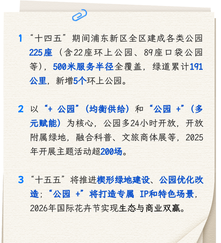 如今,遍布全区的225座各类公园,体现出浦东在“+公园”方面的建设成果,让市民显著感受到“出门就是公园”的便利。