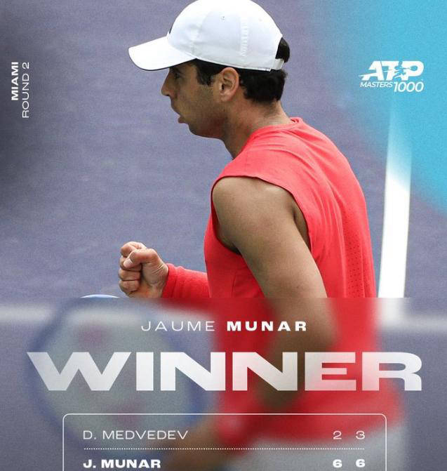 在ATP1000迈阿密赛的第二轮比赛中,穆纳尔以6-2、6-3的成绩轻松击败7号种子、2013年赛会冠军梅德维德夫,这是他首次在大师赛中击败世界前十选手,成为了一场意外的冷门。不过需要注意的是,梅德维德夫是在带伤参赛,这样的结果也是合理的。4号种子德约科维奇迎来了自2019年以来在该站的首秀,以6-0、7-6(1)战胜了土方凛辉,在结束了澳网半决赛之后连续三场失利,重拾了连胜势头。下一轮他将对阵幸运落败者卡拉贝利,后者以6-7(3)、7-5、6-3逆转32号种子米克尔森。